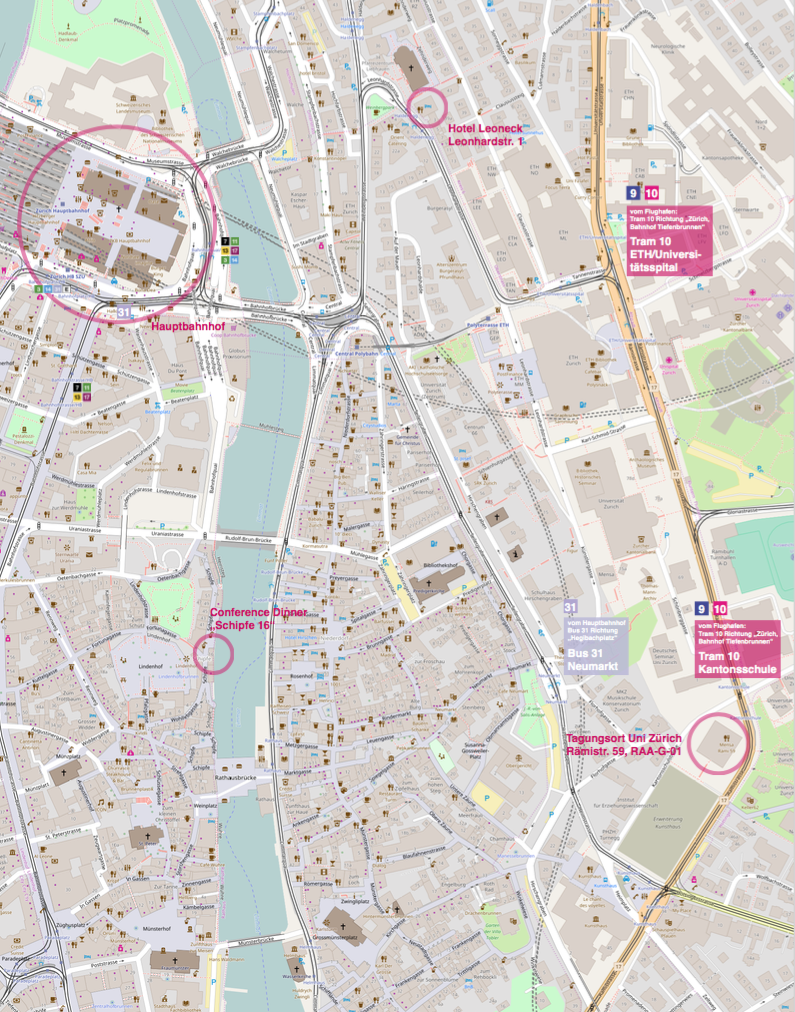 Der Tagungsort ist nahe des Hauptgebäudes der Universität Zürich, zentral in der Innenstadt gelegen. Tagungsort, Hauptbahnhof und Restaurant für das Conference Dinner sind alles fußläufig erreichbar oder mit Tram/Bus. Siehe den Situationsplan für eine Übersicht: